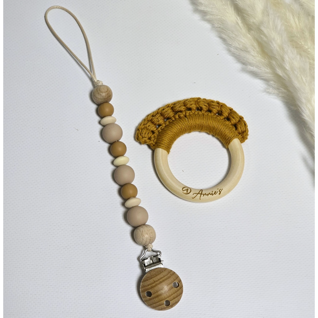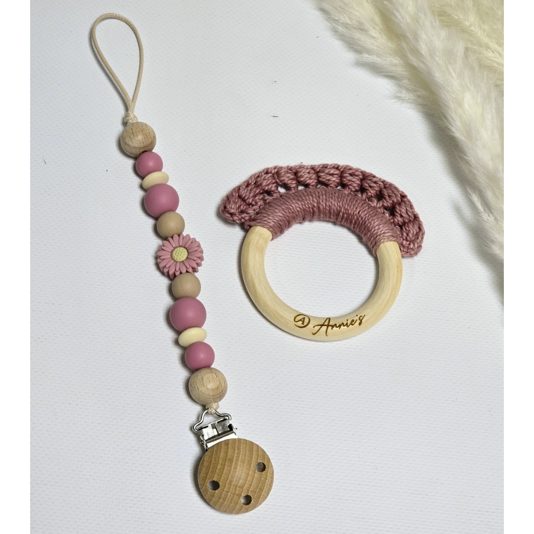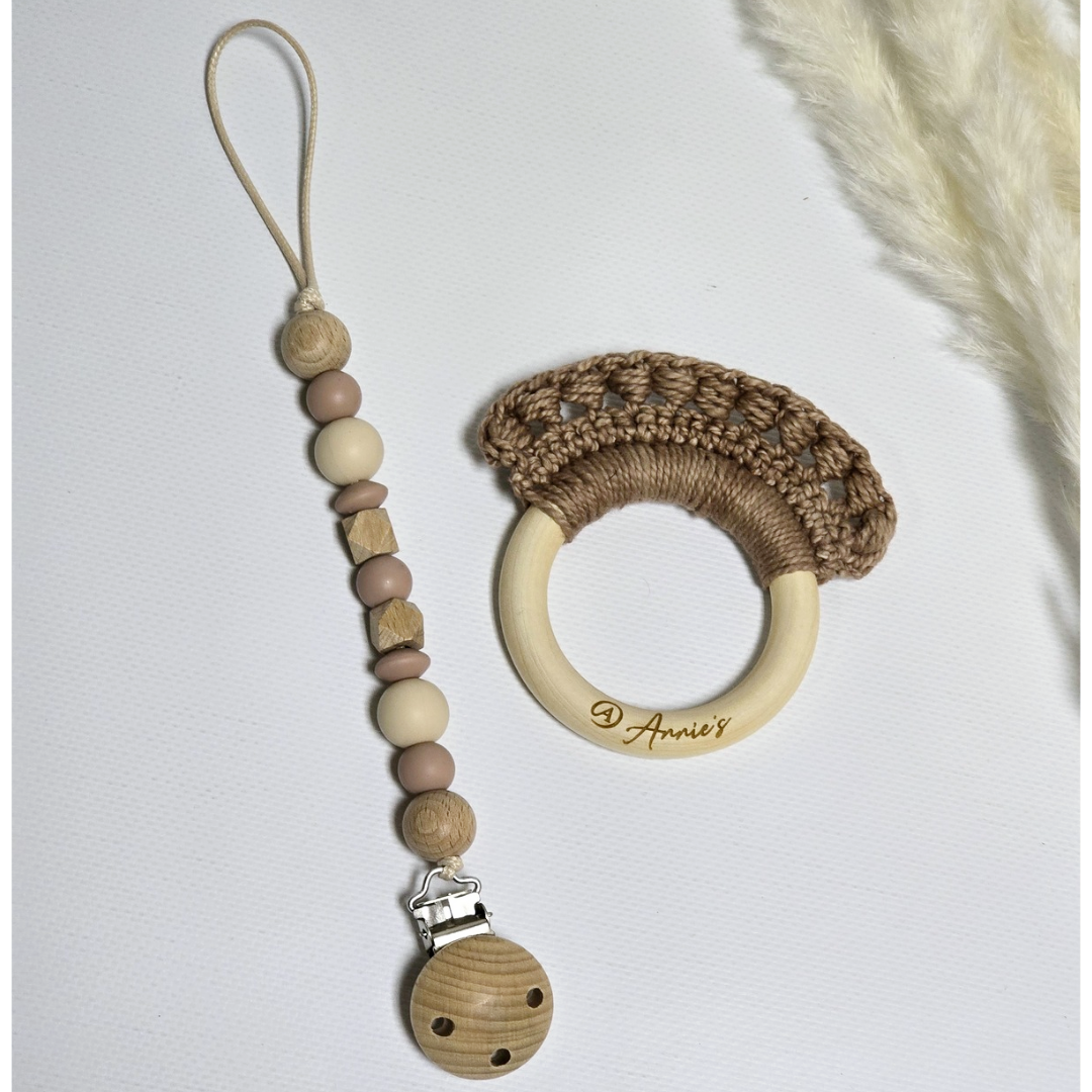 Silicone Dummy Clip and Crochet Theether made of Maple Wood and 100% Cotton yarn.